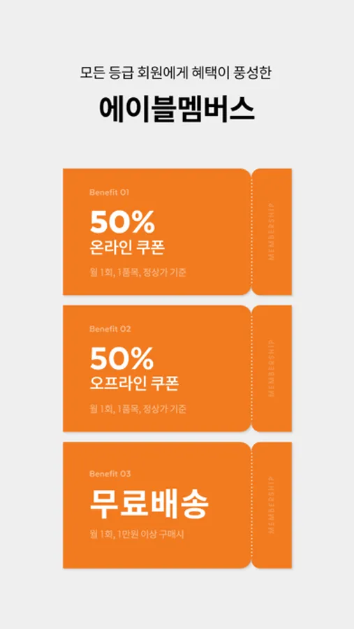 매월 50% 할인 쿠폰 부터 무료배송 쿠폰까지 모두에게 드려요.
