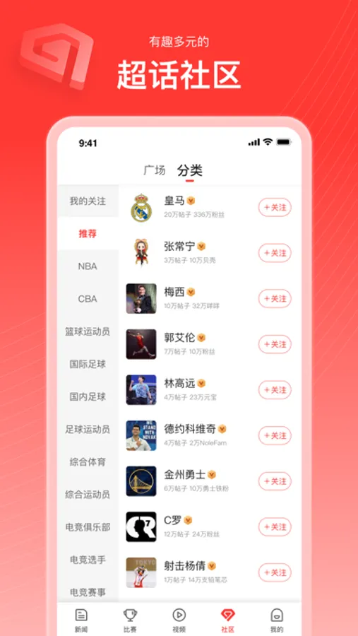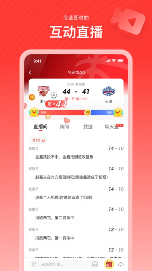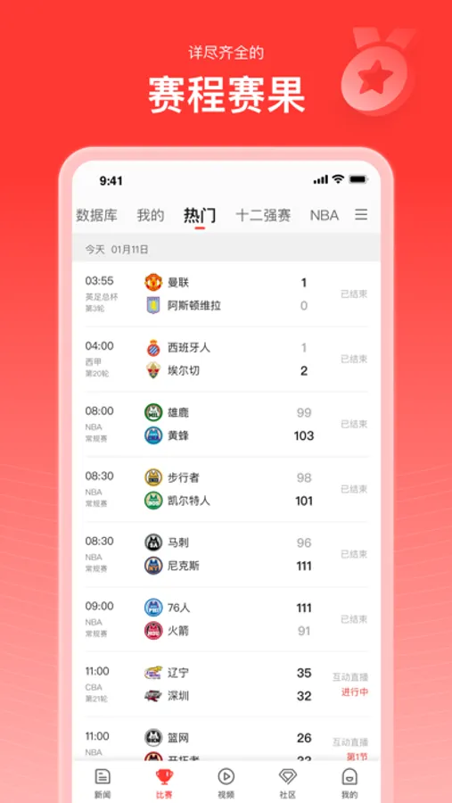比赛互动直播囊括 NBA、CBA 与英超、西甲、意甲、德甲、中超、亚冠、女排、男篮世界杯 等顶尖赛事尽在掌握;