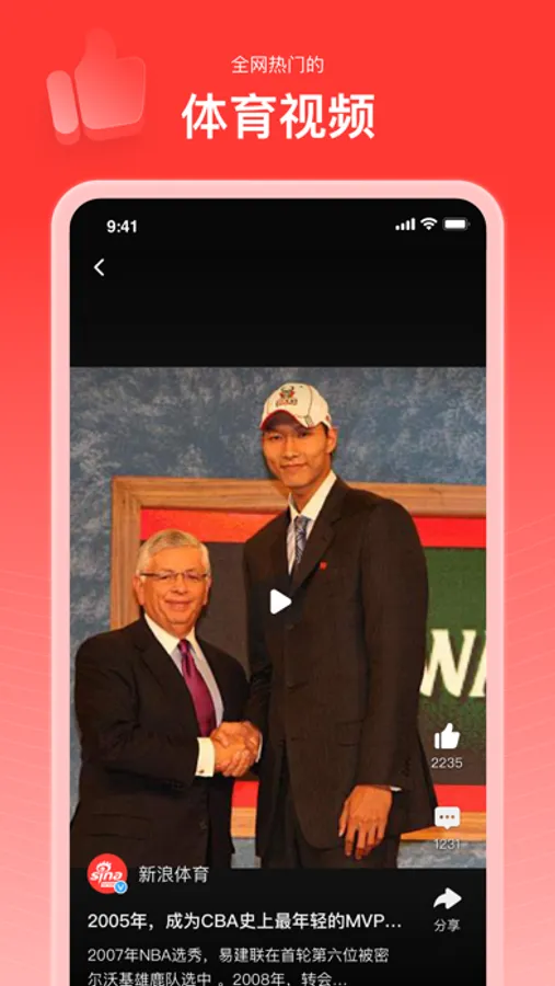 丰富的体育新闻、高质量的文章、简单的阅读方式、专题式的内容显示、全面的数据分析、 奖品多多的直播间、专业的记者团队、高质量的网友评论、爱恨分明的表态、贴心的搜索功 能、一目了然的赛事对阵,种种这些汇聚成了专注 20 年体育新闻报道的——新浪体育 APP;
