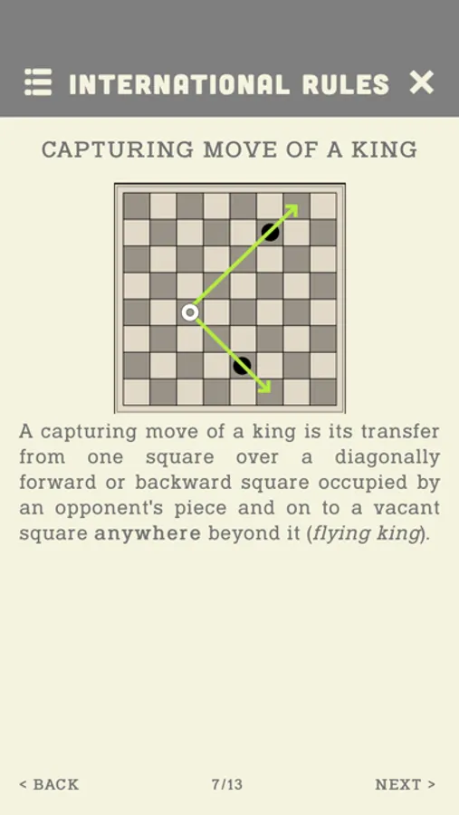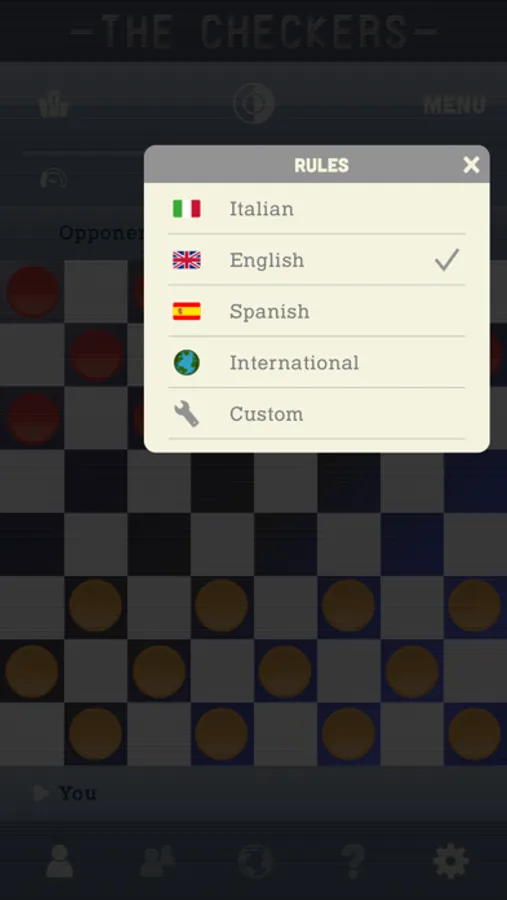 You set the rules: personalise your game or choose among the official rules of the main Checkers Federations (International/French, Italian, English, Spanish).
