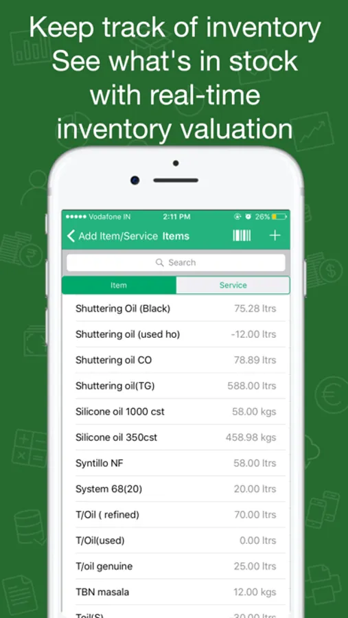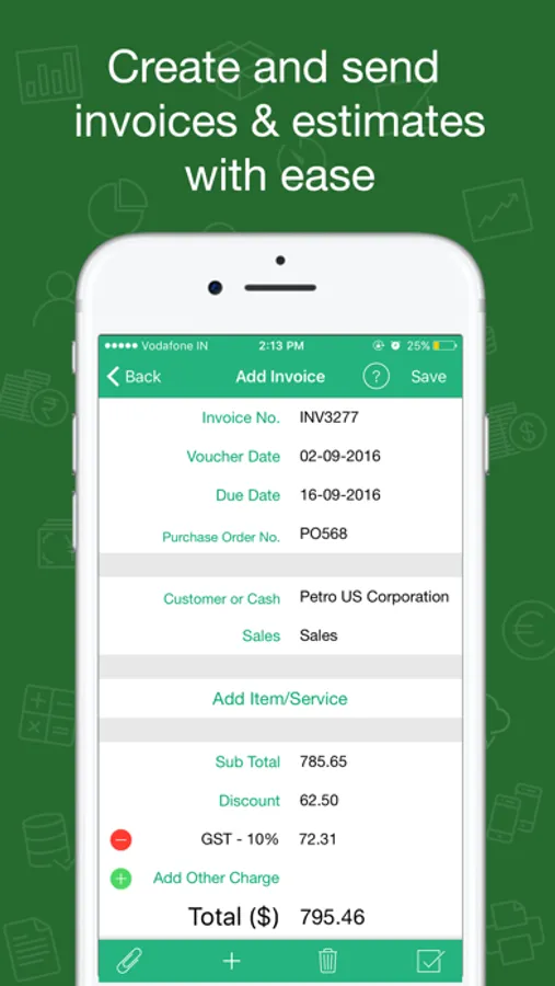 • Invoicing: Invoices for products and services; Customise invoice fields like quantity, rate, amount in words, shipping details; Add company logo to invoices; Sign your invoices; Email invoice PDF or take prints; Track paid & outstanding invoices