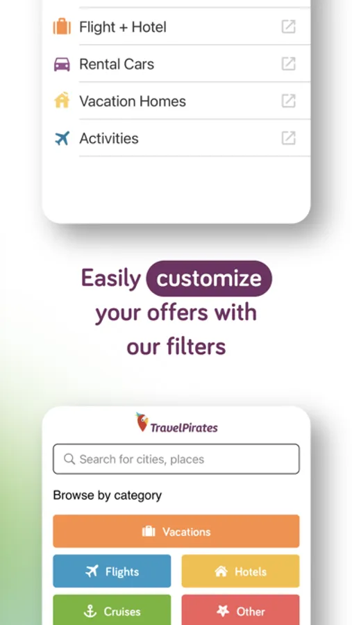 Haven’t found any travel deals for the destination you had in mind? Struggling to find a flight from your nearest departure airport? No worries! You can search for customized deals in the Booking section of the TravelPirates App. Search in our categories of Vacations, Flight + Hotel combinations, Flights only, Hotels only, and Rental Cars to find a trip that suits your needs.