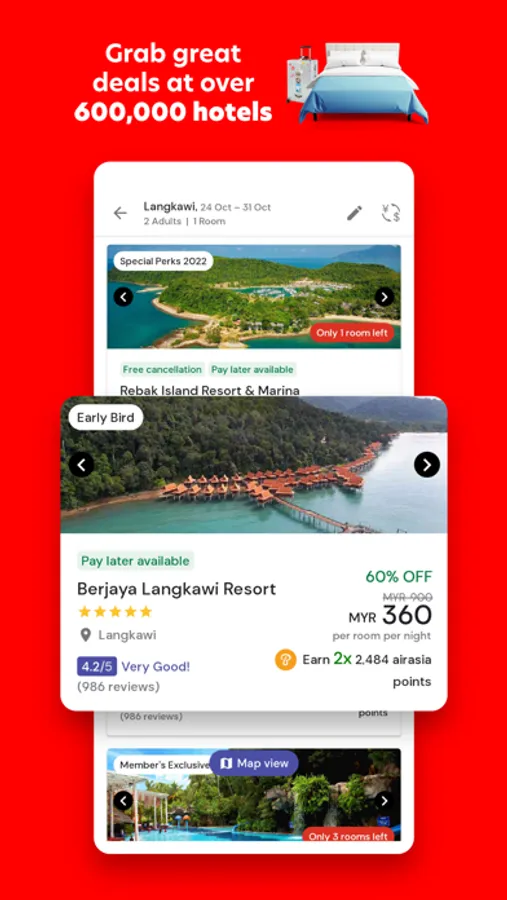 Get a list of affordable hotels when you make a hotel search on the airasia Superapp, one of the best hotel booking apps in Asean. You’ll get various hotel deals and hotel promotions on airasia hotels. Get the best airasia hotel package by booking a variety of hotel accommodations in city hotels, beach resorts, luxury hotels and even budget hotels.