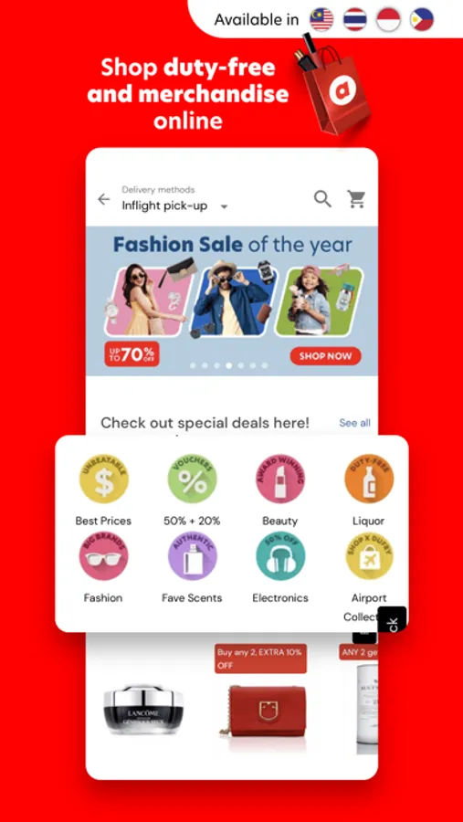 Upgrade your lifestyle with a wide range of duty free products such as cosmetics, skincare, makeup, alcohol and fragrances at airasia shop. On this online shopping app you’ll get the best duty free deals on liquor, beauty, fragrances, cosmetics, fashion and beauty products. Look out for airasia shop promotions when you order online via the app. Pick up your purchases in-flight, at the airport, in-store or get it delivered to your location of choice.