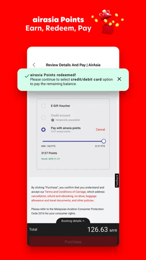 Get rewarded with airasia points for every transaction you make on the airasia Superapp. You can then use the points to redeem flight tickets and other airasia products and services.