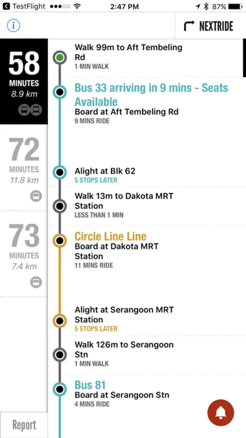 Get bus arrival time alerts along your routes if you next SG NextBus installed. With the route monitoring feature in SG NextRide, you will receive bus arrival time notification of buses as you approach your next transfer.