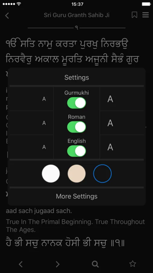 All Gurbani has english translations and romanized script for those still learning Gurbani. Turn them on/off in the settings menu.