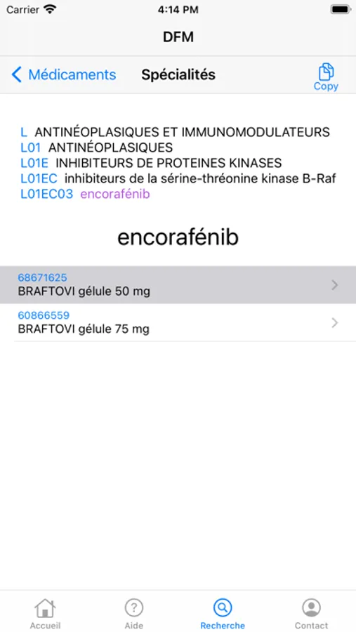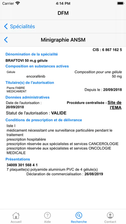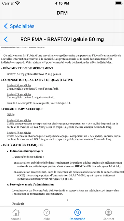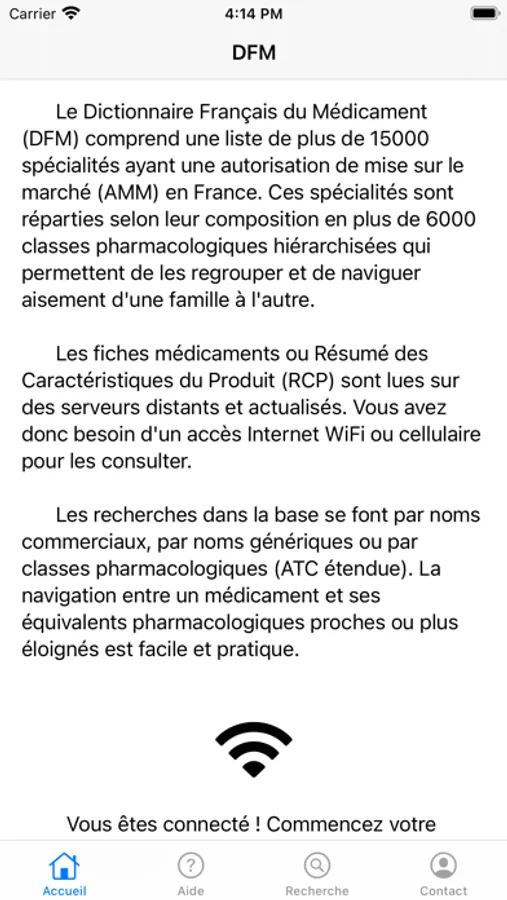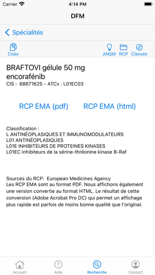 Les fiches médicaments ou Résumé des Caractéristiques du Produit (RCP) sont lues sur des serveurs distants et actualisés. Vous avez donc besoin d'un accès Internet WiFi ou cellulaire pour les consulter.