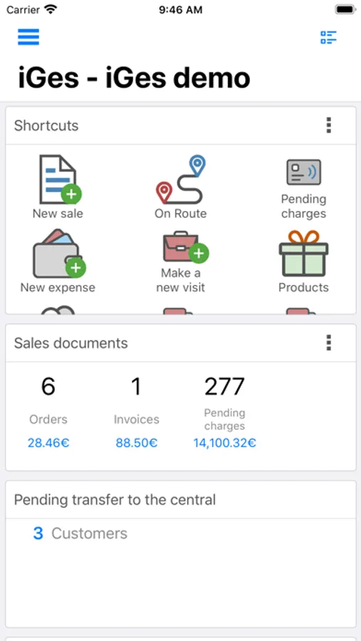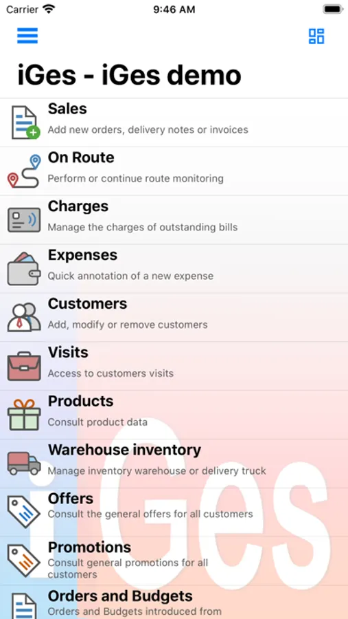 iGes is an SFA application of Presales and Invoicing designed for mobile devices with iOS (phones, tablets, ...), designed for taking orders, Delivery notes, Invoices, visits, managing routes, receipts, expenses, etc ....