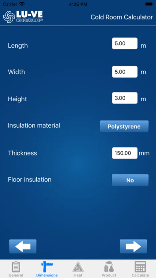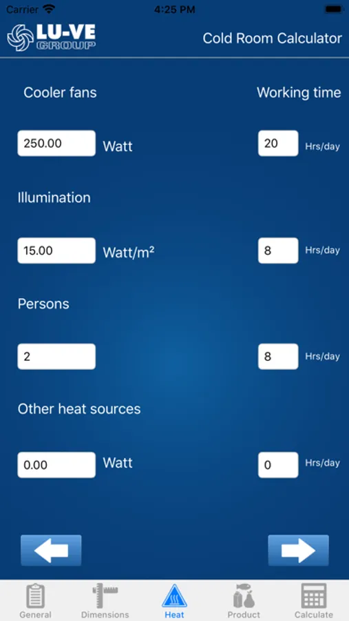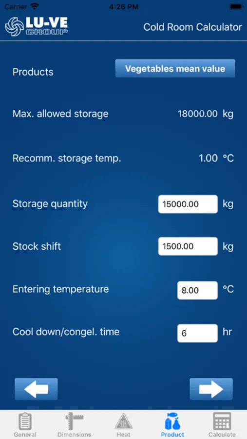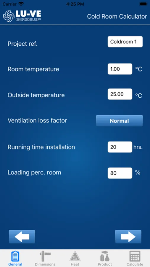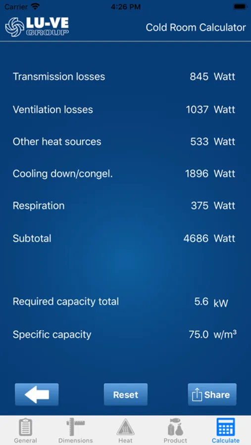 Enter your installation data in the four tabs: temperature data, cold room dimensions, isolation, heat loss and stored products. Then select the Calculate tab to instantly see the calculation for your installation. You can send the data and calculations in an e-mail to yourself or clients.