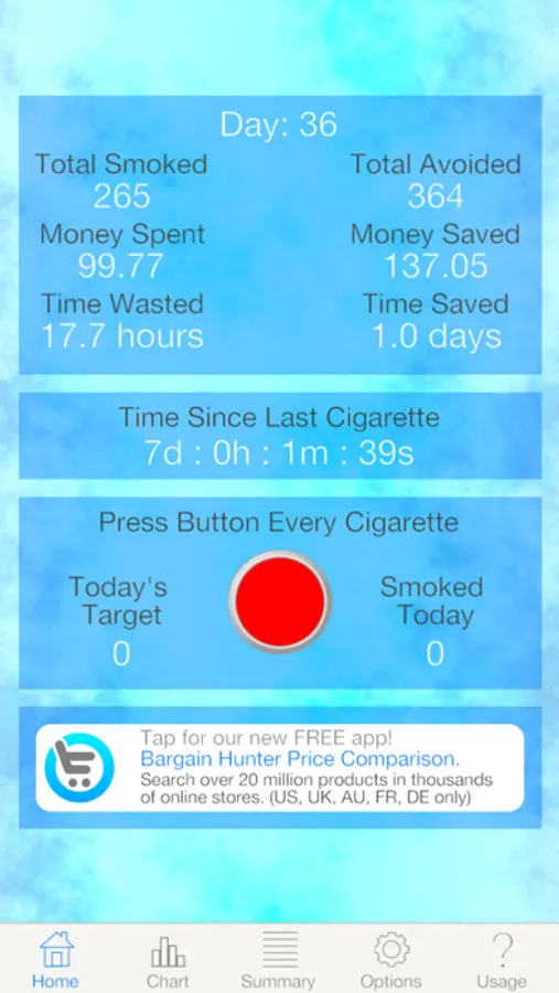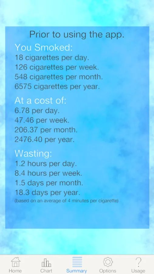 The following details are also recorded (based on how many cigarettes you initially smoked prior to using the Kick the Habit: Quit Smoking app):-