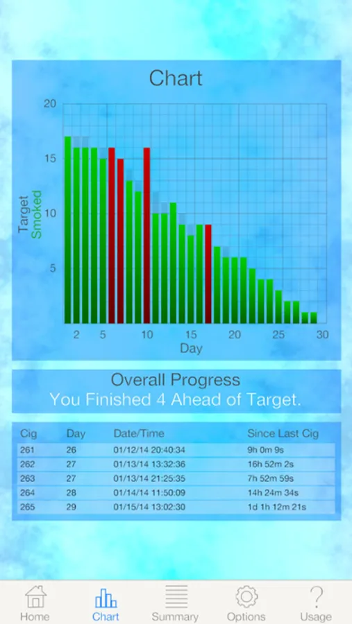 Graphical and Log Data is also presented on the Chart page, showing the amount of cigarettes smoked versus your daily targets.