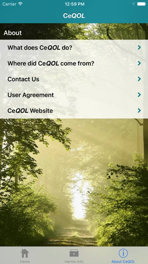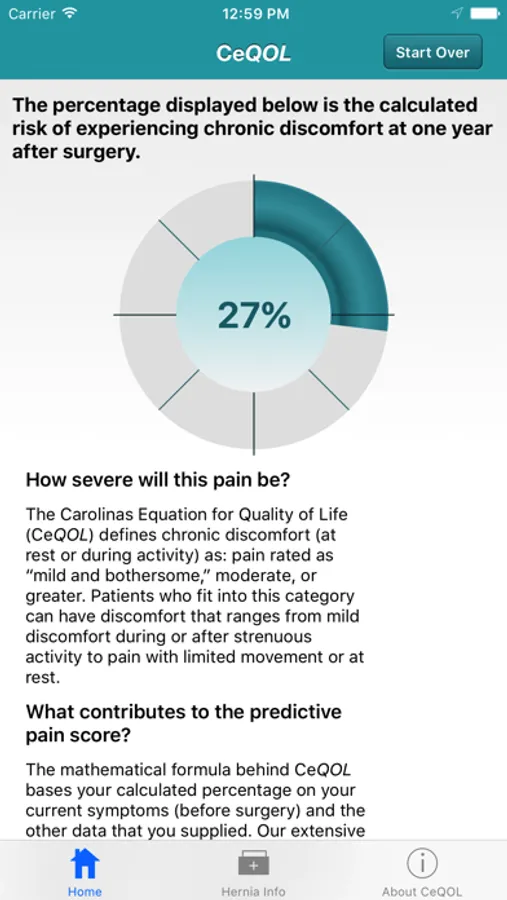 Hernia repairs are the most common operation performed worldwide. For many years, the surgical measure of success was almost solely considered to be the lack of hernia recurrence. Today, better defined surgical techniques and the use of mesh to repair a hernia have substantially decreased the incidence of surgical failure. Given this, we believe that the next phase in hernia surgery is to use a patient’s quality-of-life (QOL) as the major measure of operative success. The Carolinas Equation for Quality of Life (CeQOL) predicts the incidence of chronic pain following inguinal hernia repair in males. Male users simply answer 18 simple questions about themselves, their hernia, and their current QOL status as it relates to their hernia, and a percentage chance of having some form of discomfort 1 year following surgery is produced and interpreted. The complex mathematical equation, which was derived from closely following patients from around the world after their surgery, has been independently tested and found to be accurate and reliable. Our ultimate goal is to use mobile app technology to provide surgeons and patients with a powerful educational tool that can predict individualized QOL outcomes after inguinal hernia surgery and offer patients extensive educational materials concerning many types of hernias and their treatments.