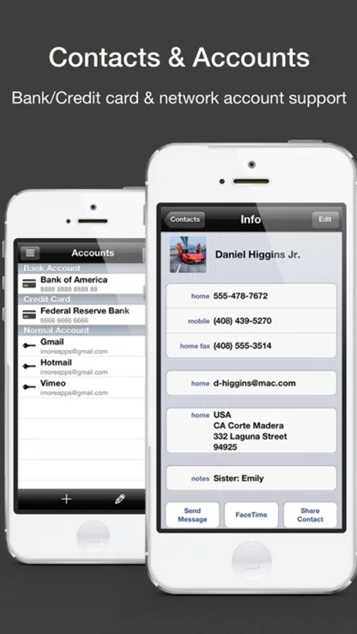 Secrets Folder is designed for your sensitive data. Now, you can place all your most important photos, videos, notes, contacts, bank accounts, voice memos and browse bookmarks all in one place and lock them with passcode.