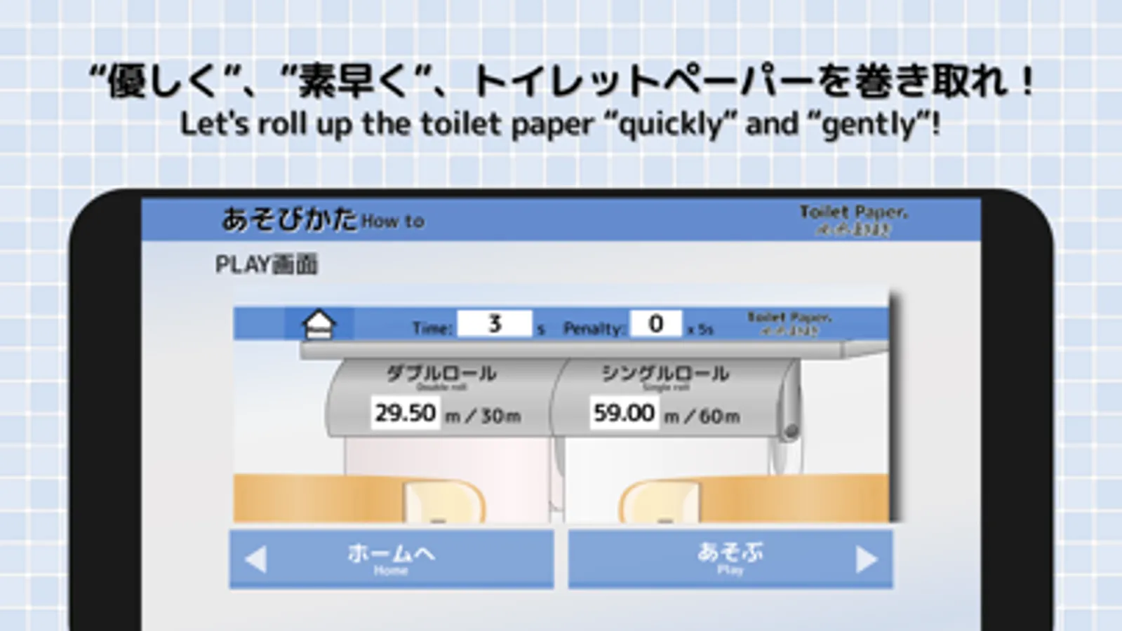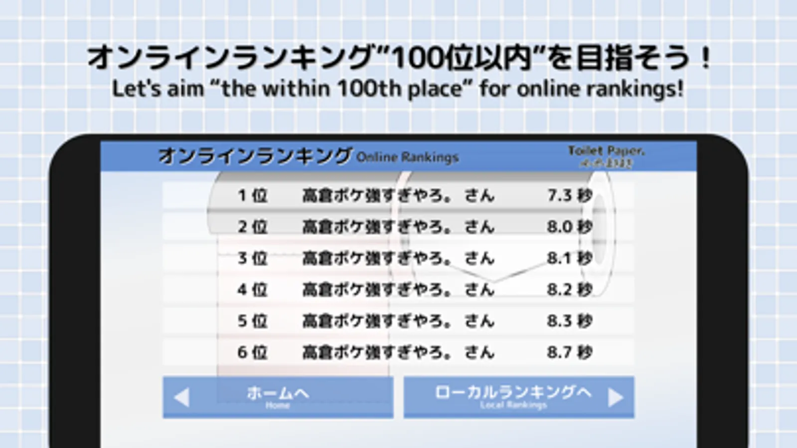 *2 The data registered in the online ranking is the nickname you entered in the registration form , your game result (time to roll up two toilet papers), and the date and time when you registered it.