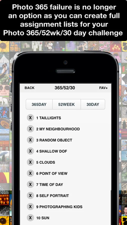 The app will generate a full assignment list for your Photo 365/52 week/30 day challenge. With the daily reminder, there should be nothing stopping you from completing it!