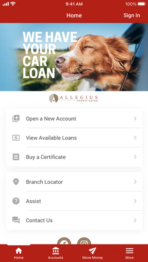 Allegius Credit Union Mobile provides members convenient access to our website, mobile banking, branch and contact information.