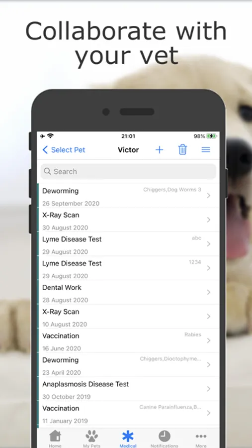 * Create pet's medical record (vaccinations, deworming, treatments, clinic visits, diagnostic exams, etc)