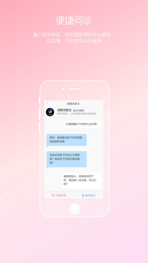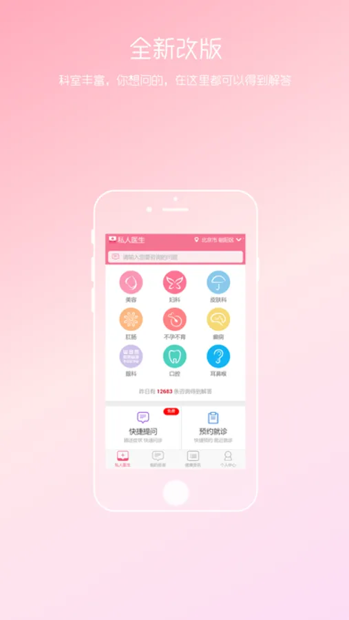 本产品专门针对女性私密健康,美容整形,不孕不育等其他专科类健康问题,提供免费的医疗健康咨询和生活健康指导。妇科,女性痛经等私密尴尬病症总是难以启齿;挂号难,排队久,长时间等候换来不到5句话的答复,此类问题给患者带来诸多不便。本产品集合多个科室,不同病症选择不同科室分类咨询;简单快捷的提问过程,让您随时随地享受VIP健康咨询服务。(建议允许定位以便能准确分配到所在地医院)。