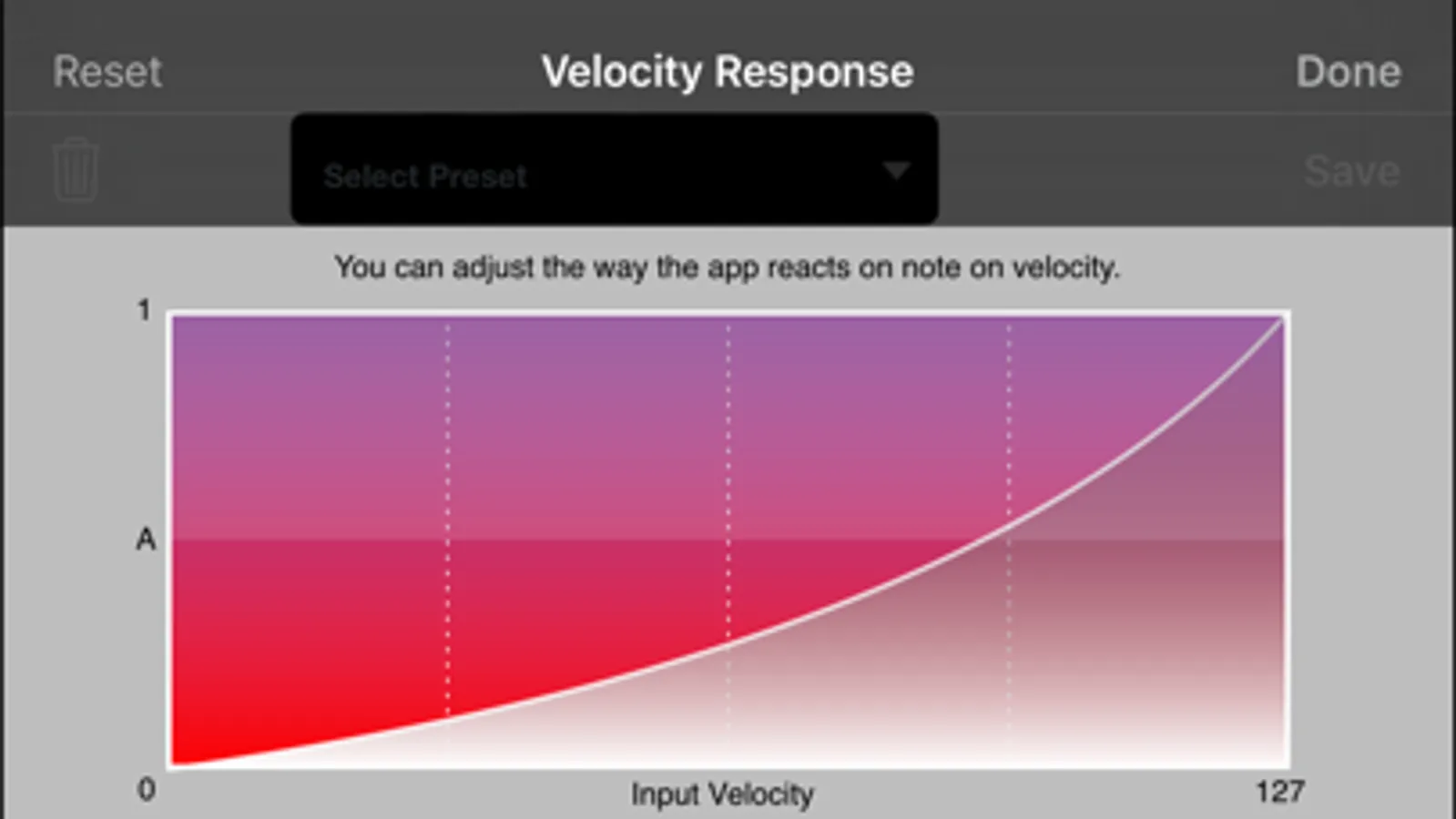 - MIDI velocity response curve editor to fine tune the feeling of your MIDI keyboard, save them as presets if you use more than one keyboard.