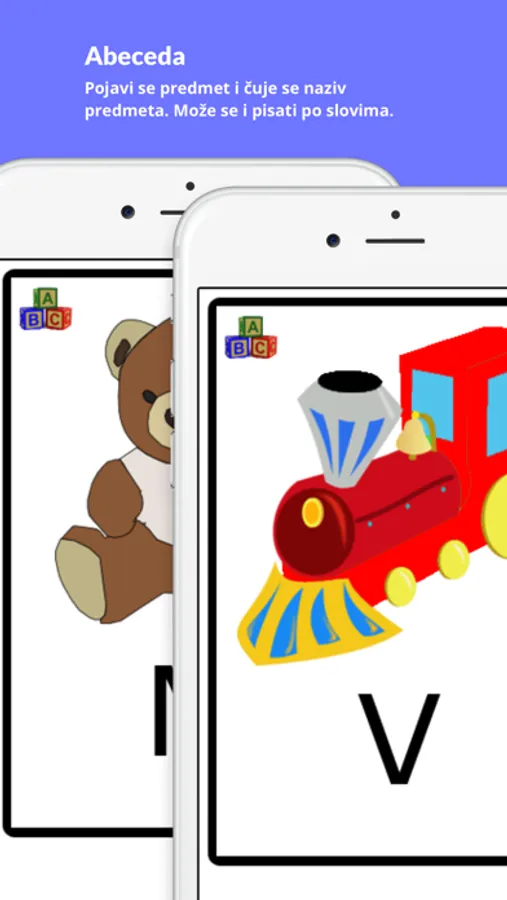 U 'Abecedi' vaše dijete može naučiti slova abecede i kako se pišu i izgovaraju ta slova. Za svako slovo postoji slika sa pojmom koji počinje s tim slovom.