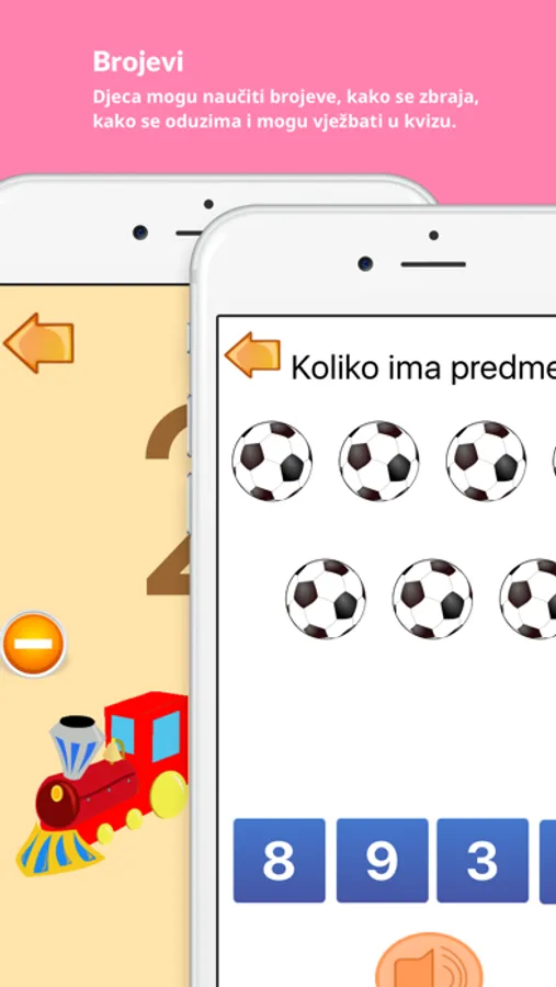 Kod 'Brojeva' se mogu naučiti brojevi od 1 do 20 te potoje tri kviza preko kojih dijete može naučiti osnove brojanja, zbrajanja i oduzimanja.