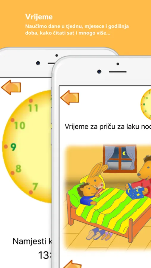 Aplikacija 'Vrijeme' opisuje koliko dana ima tjedan, koliko mjeseci ima godina i koja godišnja doba postoje i koliko je sati na satu. Ujedno se i opisuje što se sve preko dana treba raditi i kada kao npr. da se u 8h ide u školu te da je ručak u 15h. Ima i dio u kojemu se treba namjestiti kazaljke na satu na tražen vrijeme kao npr. 'namjesti kazaljke na 8h'. Također postoje kvizovi koji testira znanje vašeg djeteta vezano za vrijeme, oblike i boje i životinje.