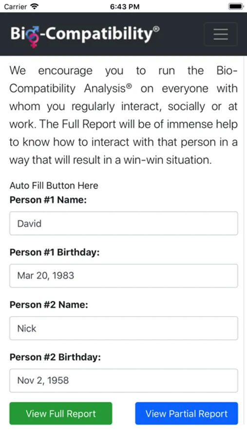 You can now find the love of your life. No need to settle for less. If you have been getting involved with people who make you unhappy, a Bio-Compatibility Analysis® can help you to determine why. The data is based upon your birth date. You will be surprised how amazingly accurate it is. This full, paid version offers complete analyses of your physical, mental and emotional compatibility with others.