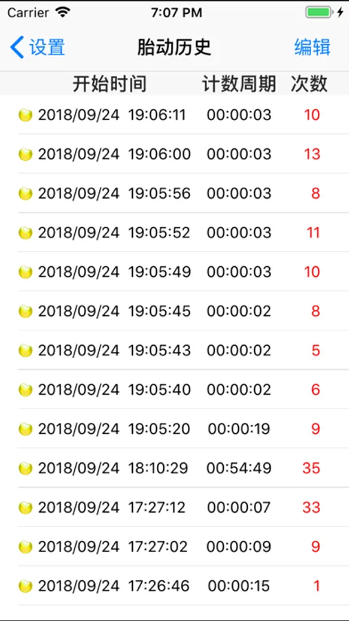 App默认5分钟内重复胎动为一次有效记录,此间隔可通过设置界面自定义。如果计数不满一小时,也可以手工保存并随时通过历史记录功能编辑删除。