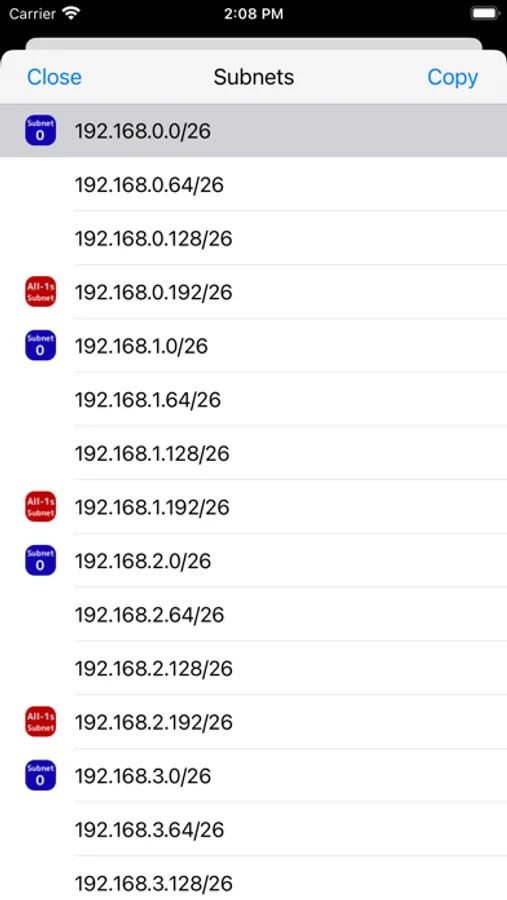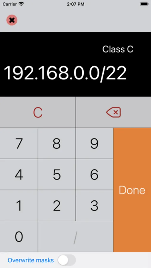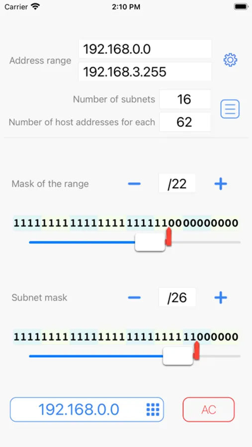 The list of networks is made when IP address and masks are entered. Characteristic (Subnet Zero, All-Ones Subnet, Super net) of networks is indicated with icons on list of networks. Sliders for masks and keypad for IP address helps quick entry.