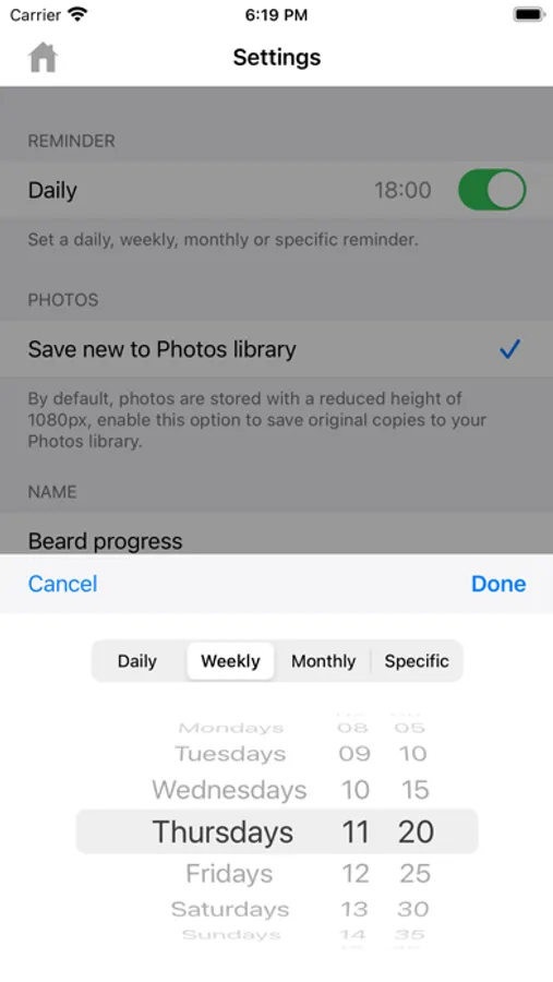 • Set daily, weekly, monthly, and specific date reminders