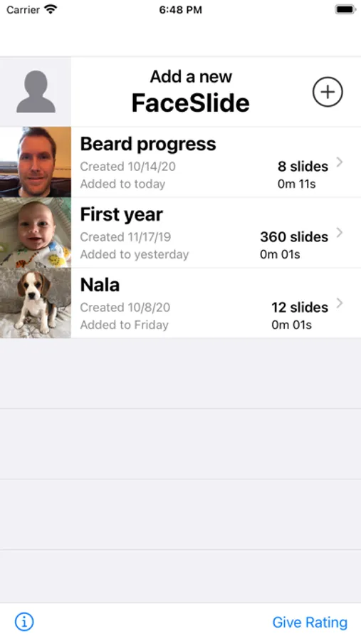 Set reminders, adjust photos, change order and timings, create videos, and preview FaceSlides at any time.