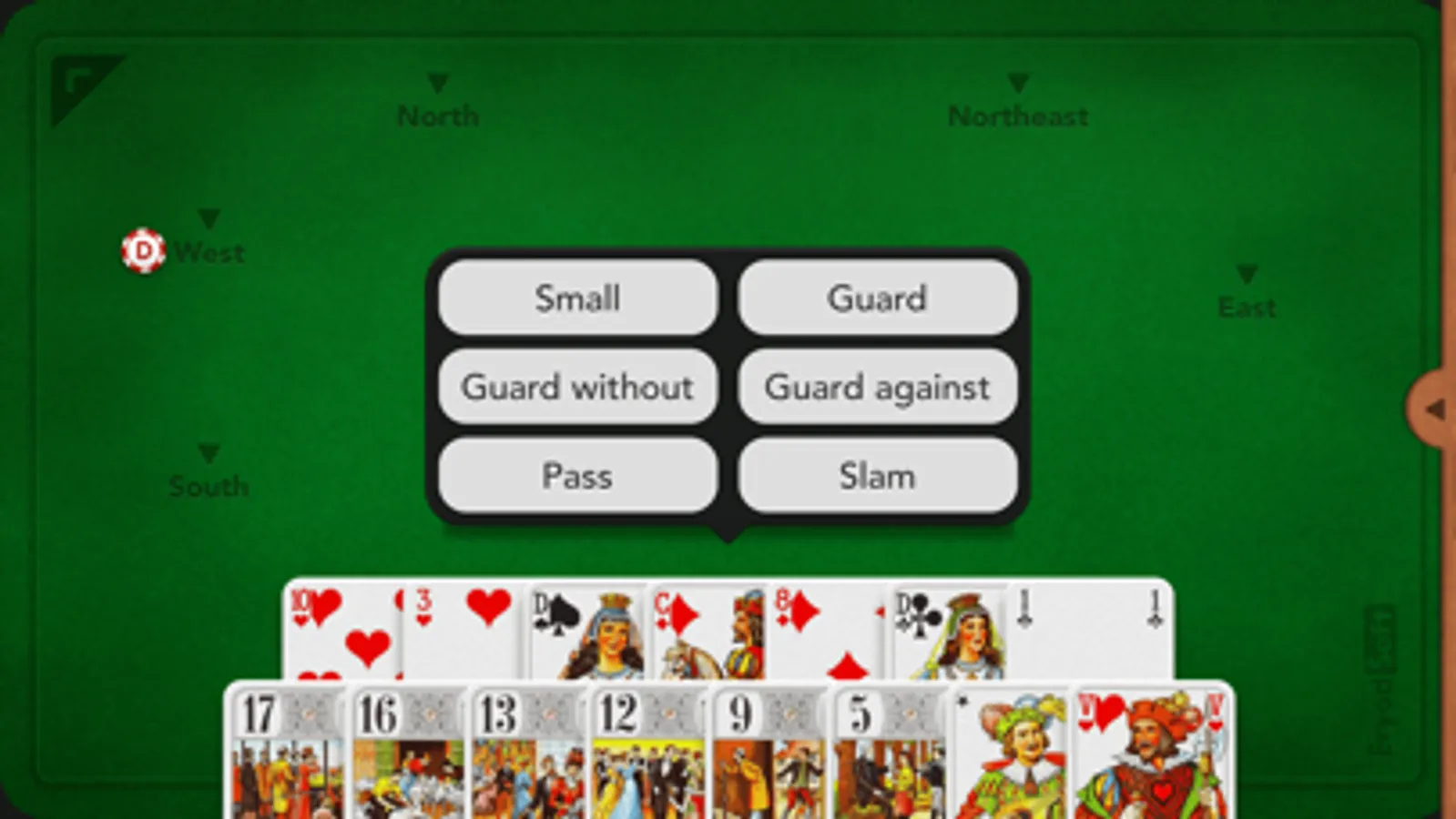 Your opponents and teamates are simulated by an high-level artificial intelligence, that knows the common strategies used in tarot card game. Therefore the game is very realistic, close to game with real players, and the challenge is high.