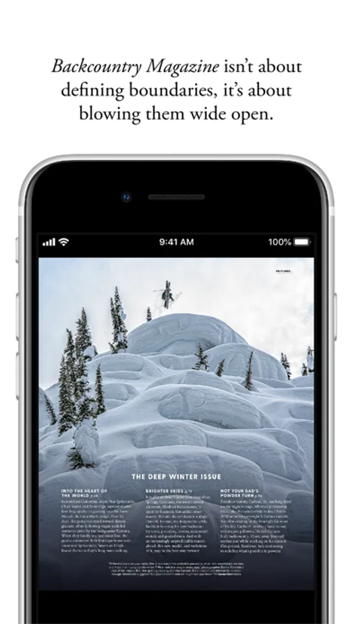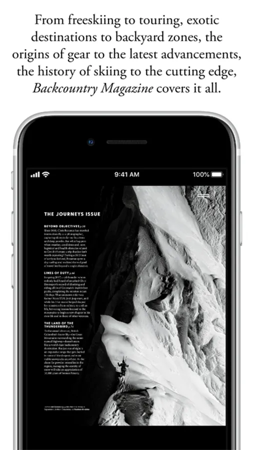 Backcountry Magazine isn’t about defining boundaries, it’s about blowing them wide open. More people than ever are redefining their ideas of skiing and snowboarding, and Backcountry is their tool; a conduit and catalyst of the backcountry revolution. Each issue of Backcountry is packed with high-definition photography and stories, trusted avalanche safety skills and reliable, unbiased gear reviews. From freeskiing to touring, exotic destinations to backyard zones, the history of skiing to the cutting edge, we cover it all. In Backcountry, the possibilities are limited only by your imagination. Join us and imagine your Untracked Experience.