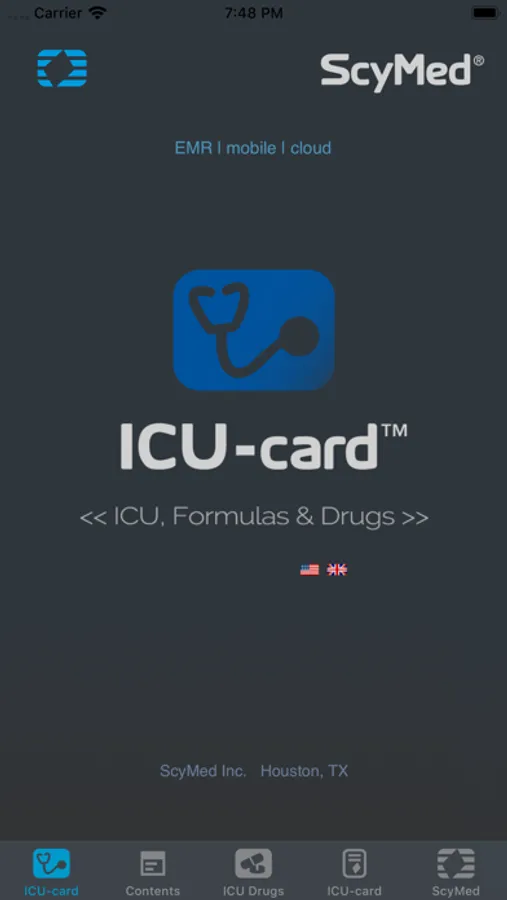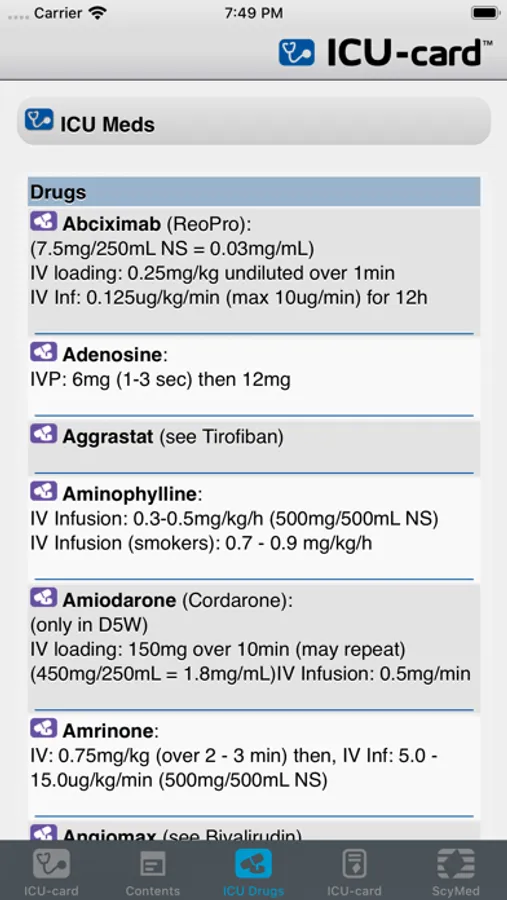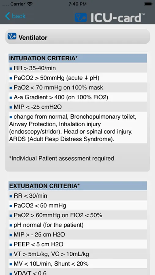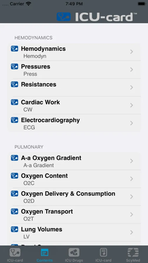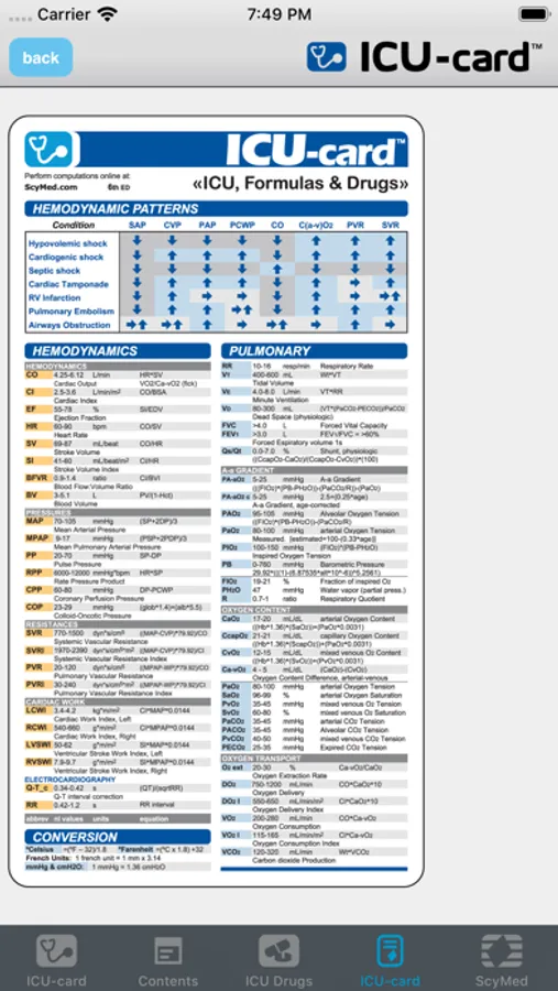 The ICU-card™ App includes drugs, dosages, formulas, equations and normal values for hemodynamics, pulmonary, renal, nutrition, etc.