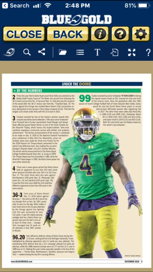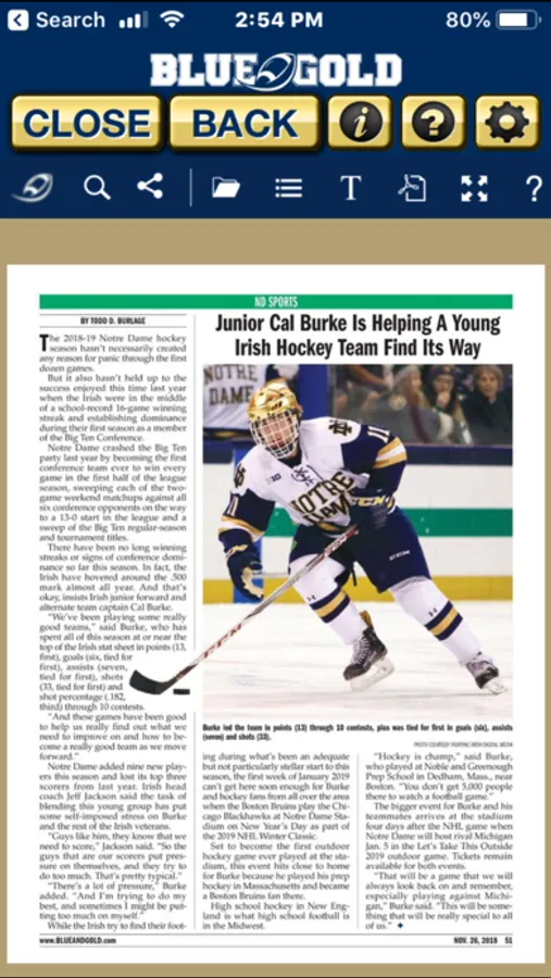 The digital magazine includes everything from the print issue. Plus, during football season you can access the weekly newsletter, Blue & Gold Report, for game previews and football team updates within the app.