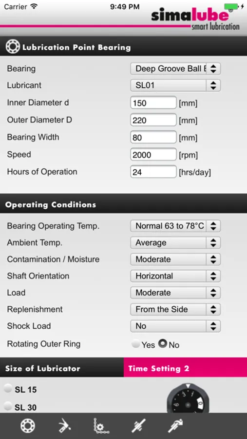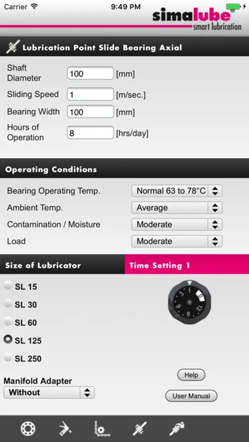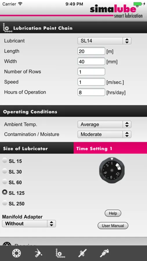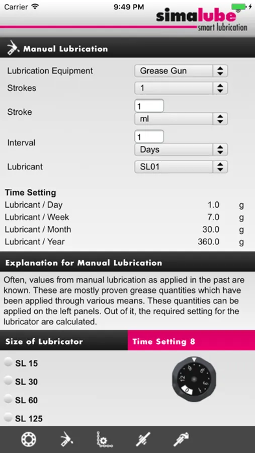 Calculation Pro ist eine einfach zu bedienende mobile App die Ihnen hilf, folgende Werte für den automatischen simalube Schmierstoffspender zu bestimmen: