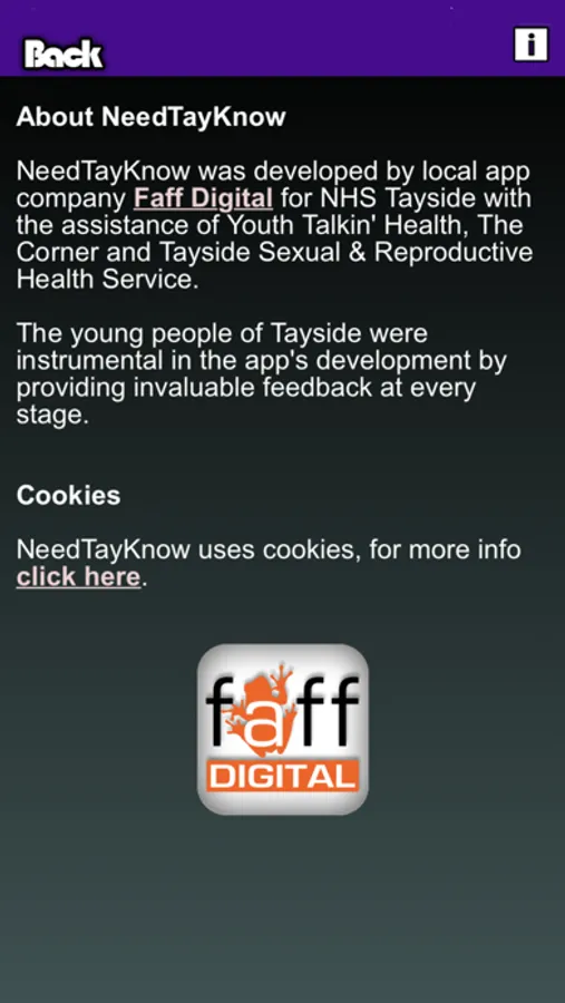 NeedTayKnow - A health information app for young people in Tayside encouraging safer sex and providing details of services in the area.