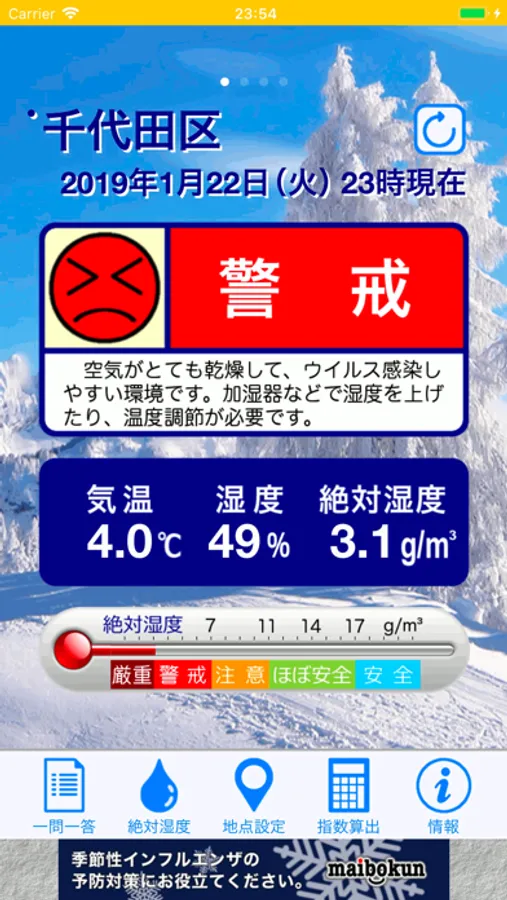 今後24時間の「絶対湿度」予報をお知りになりたいときは、姉妹アプリ「インフルエンザ予報計」をご利用ください。
