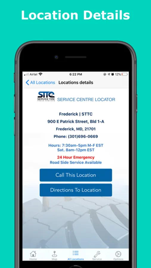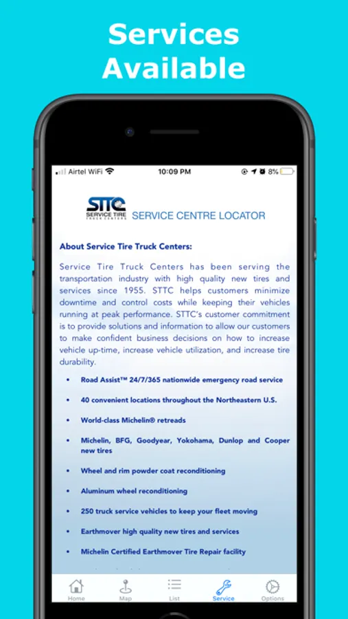Find the nearest STTC | Service Tire Truck Centers from the road using your iPhone. Use the app to find the closest STTC location or browse through all STTC locations.  Get directions, business hours, telephone numbers, and our 24 hour nationwide truck tire Road Assist service number with one tap. Have a truck tire roadside emergency outside of the STTC service area anywhere in the U.S.?  No problem. Just call our exclusive RoadAssist™ 24 Hour Emergency roadside service hotline. We're here to minimize your downtime to keep you moving.