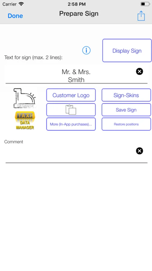 If you like this app (or like to get the ads removed) you are invited to buy "Taxi Data Manager" to get a full suite of features around scheduling tours, monitoring shifts and timesheets. Within "Taxi Data Manager" the sign is automatically generated from the Data, that is used for scheduling the tour.