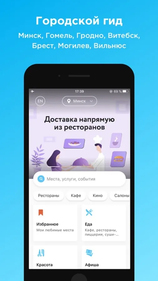 • Сотни интересных событий: кино, концерты, вечеринки, спектакли, спортивные мероприятия, тренинги, мастер-классы, выставки, живая музыка в ресторанах и др.