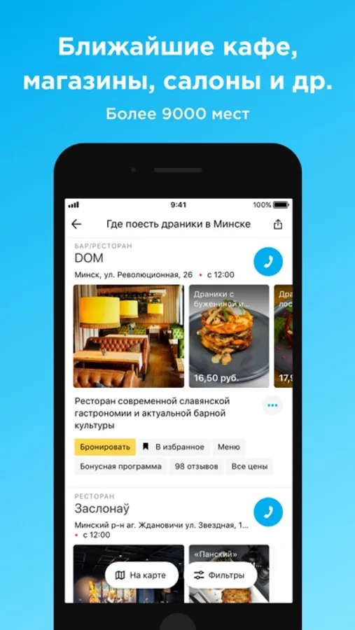 • Интерактивная карта для поиска ближайших заведений и вызов навигатора Яндекс, Google, MAPS.ME прямо с карточки места.