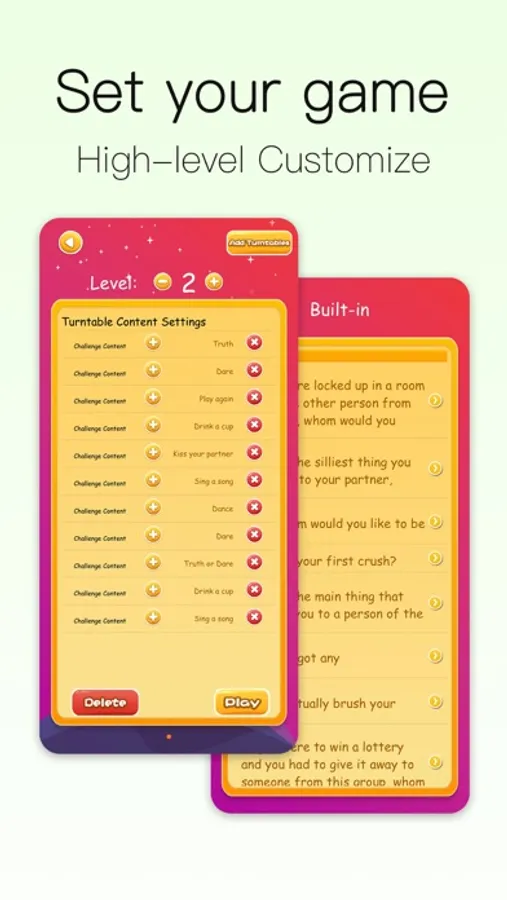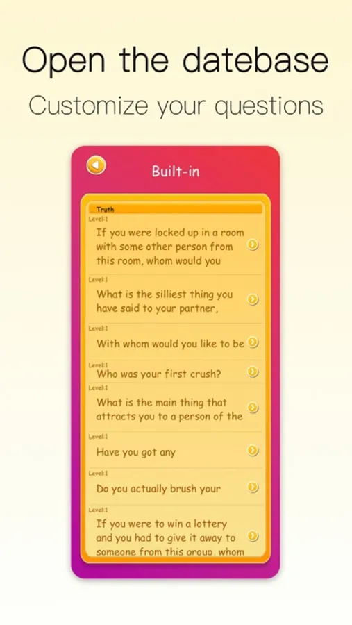 - Question bank model: set the question level, and choose truth or dare. There are 200 questions available!