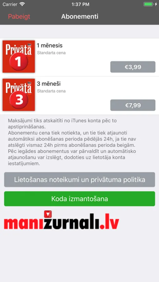 * Maksājumi tiks atskaitīti no iTunes konta pēc to apstiprināšanas. Abonementu cena tiek notiekta, un tie tiek atjaunoti automātiksi abonēšanas perioda pēdējās 24h, ja tie nav atslēgti vismaz 24h pirms abonēšanas perioda beigām. Pēc iegādes abonementus var pārvaldīt un automātisko atjaunošanu var izslēgt, dodoties uz lietotāja konta iestatījumiem.