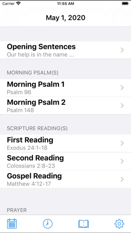 The app provides liturgies Morning, Midday, Evening, and Close of Day Prayer, selecting the appropriate service and lectionary readings based on the time and date settings of your iPhone or iPad. The calendar tool allows users to find psalms, readings, and prayers for other dates. Use the clock icon to select Morning, Midday, Evening, or Close of Day Prayer, overriding current time of day.