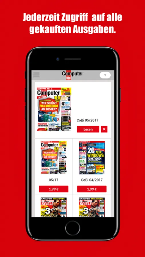 Mit dieser App können Sie die aktuelle Ausgaben der COMPUTER BILD und COMPUTER BILD Spiele für 1,99 Euro kaufen. Alle in der App gekauften Ausgaben bleiben erhalten, so dass Sie auch zu einem späteren Zeitpunkt jederzeit in älteren Ausgaben stöbern können.