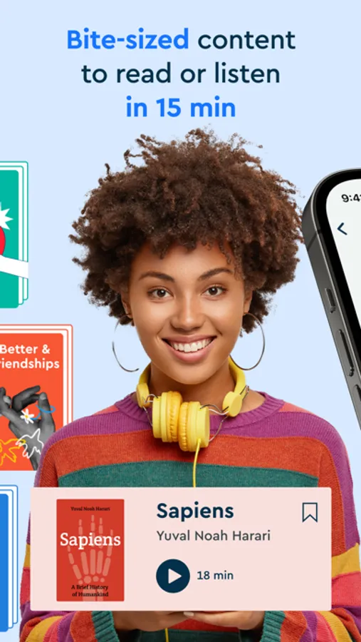 • Listen to audiobooks like "Sapiens", "The Art of War" or "The 5 AM Club"