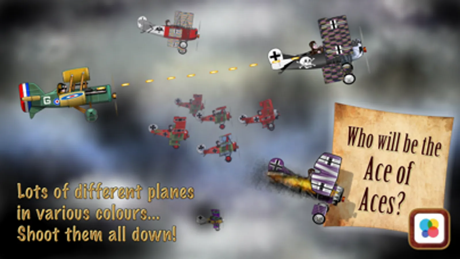 Lots of WW1 planes in many colour schemes are waiting to be shot down: