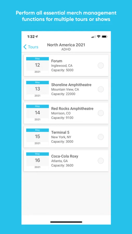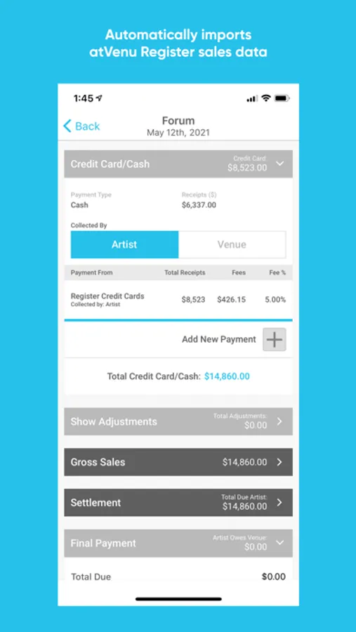 Select your current show right from your iOS device, enter your sales, collect the Venue rep signature and complete your show. All sales are uploaded to your atVenu account and routed to all the correct people who need to see them.
